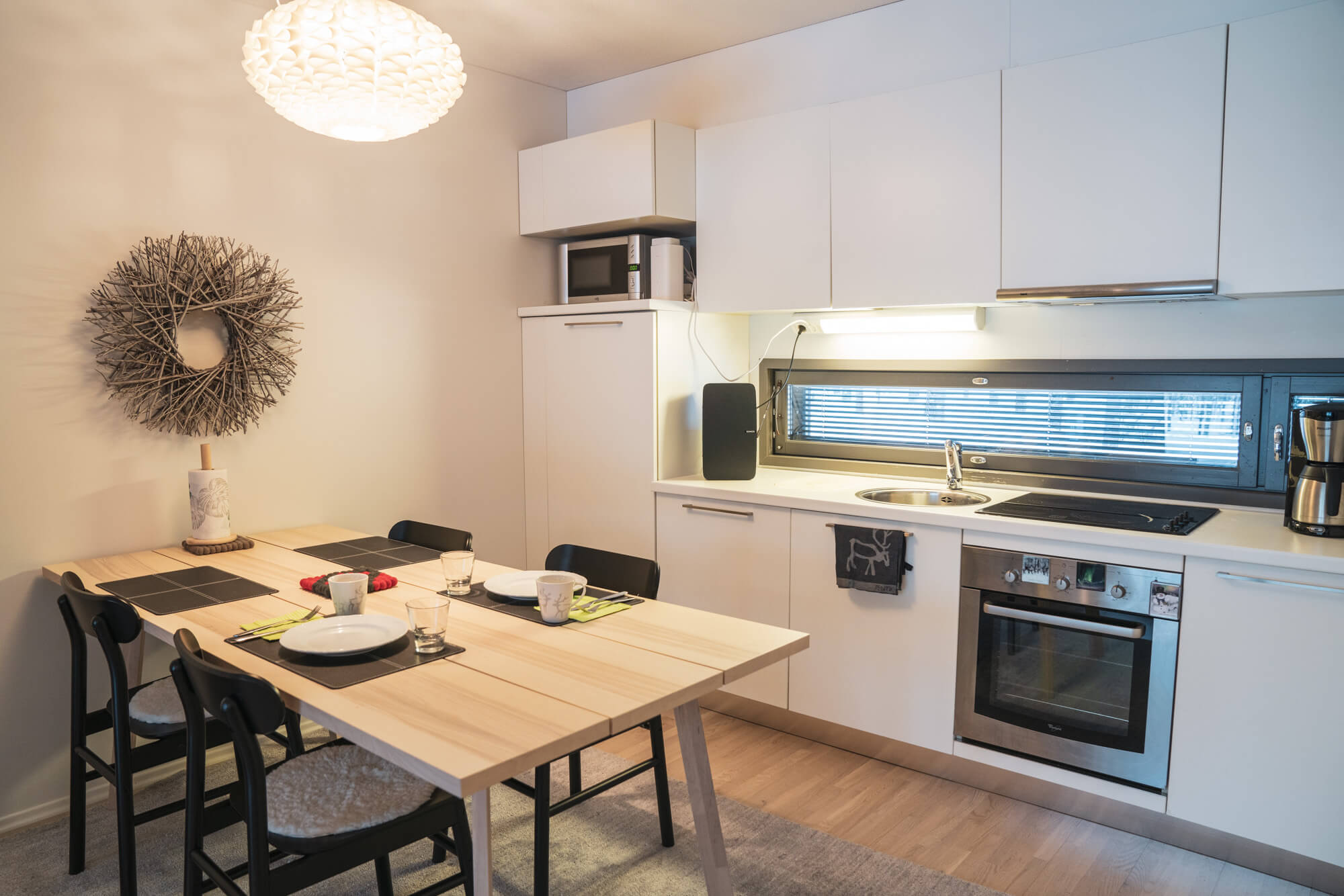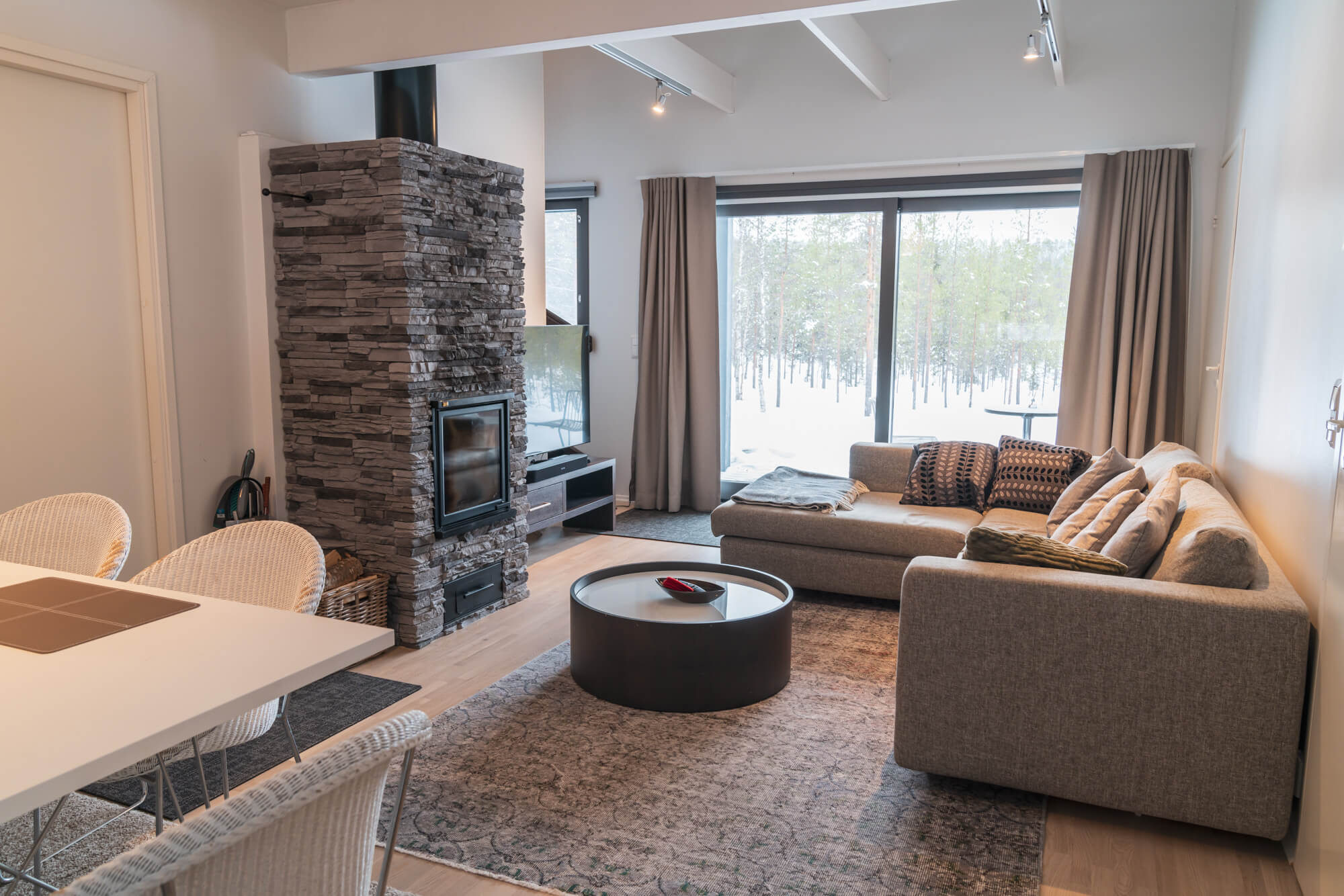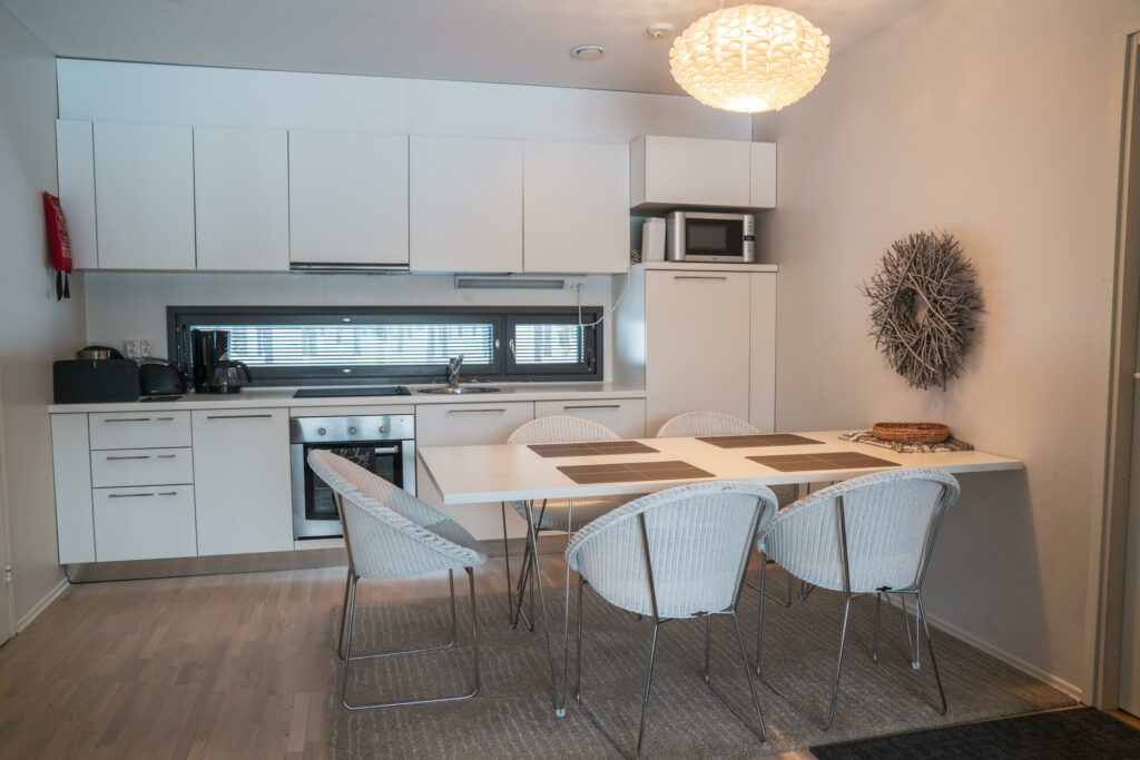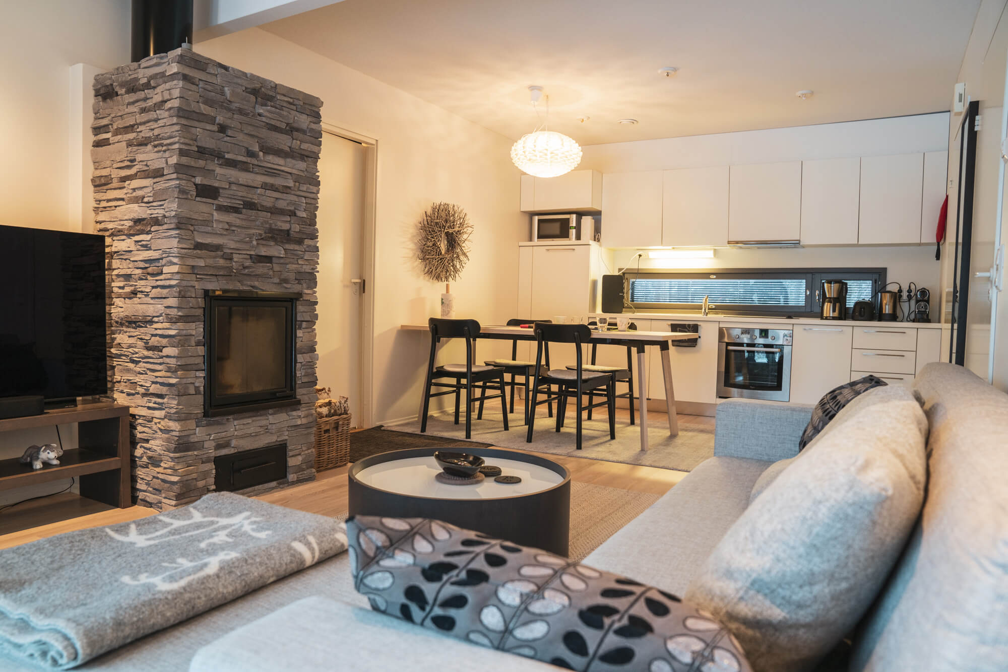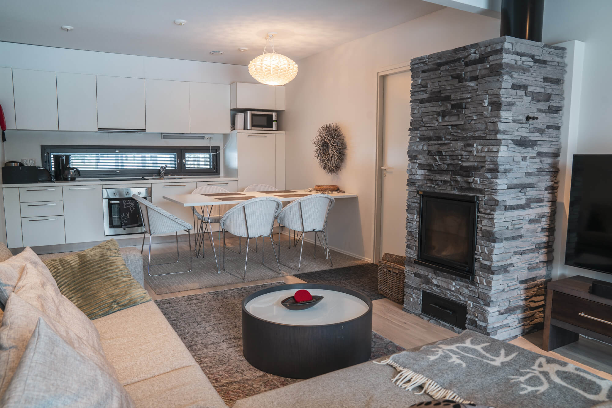Modernissa keittiössä onnistuu mainiosti lomakokkailut ja tunnelmaa viihtyisään oleskelutilaan tuo takka.