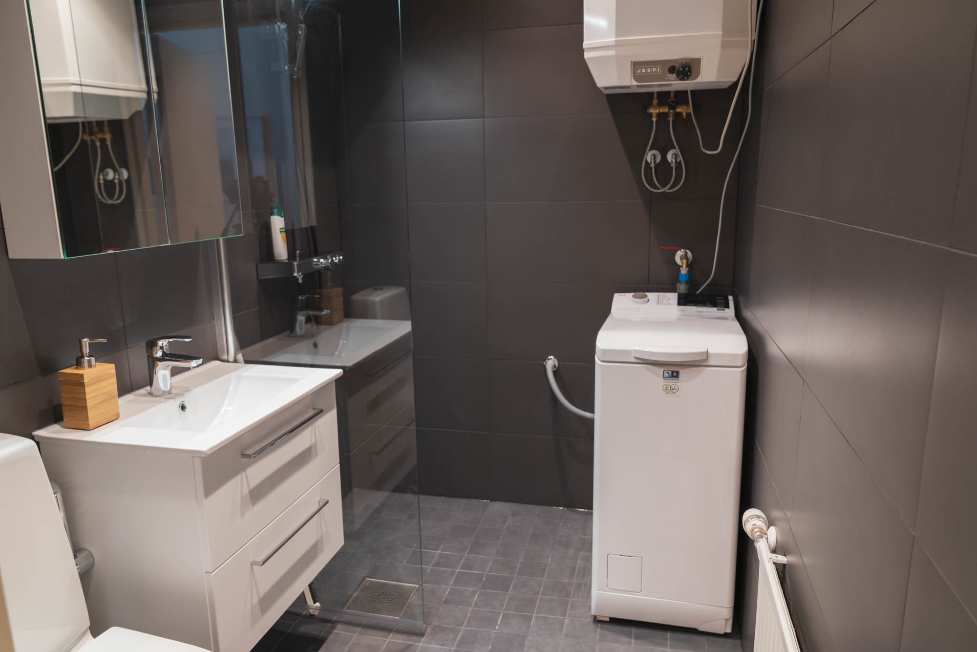 Mukavan kokoisesta kylpyhuoneesta löytyy laadukkaat kalusteet sekä pyykinpesukone. Oivallinen pariskunnalle tai pienelle perheelle.