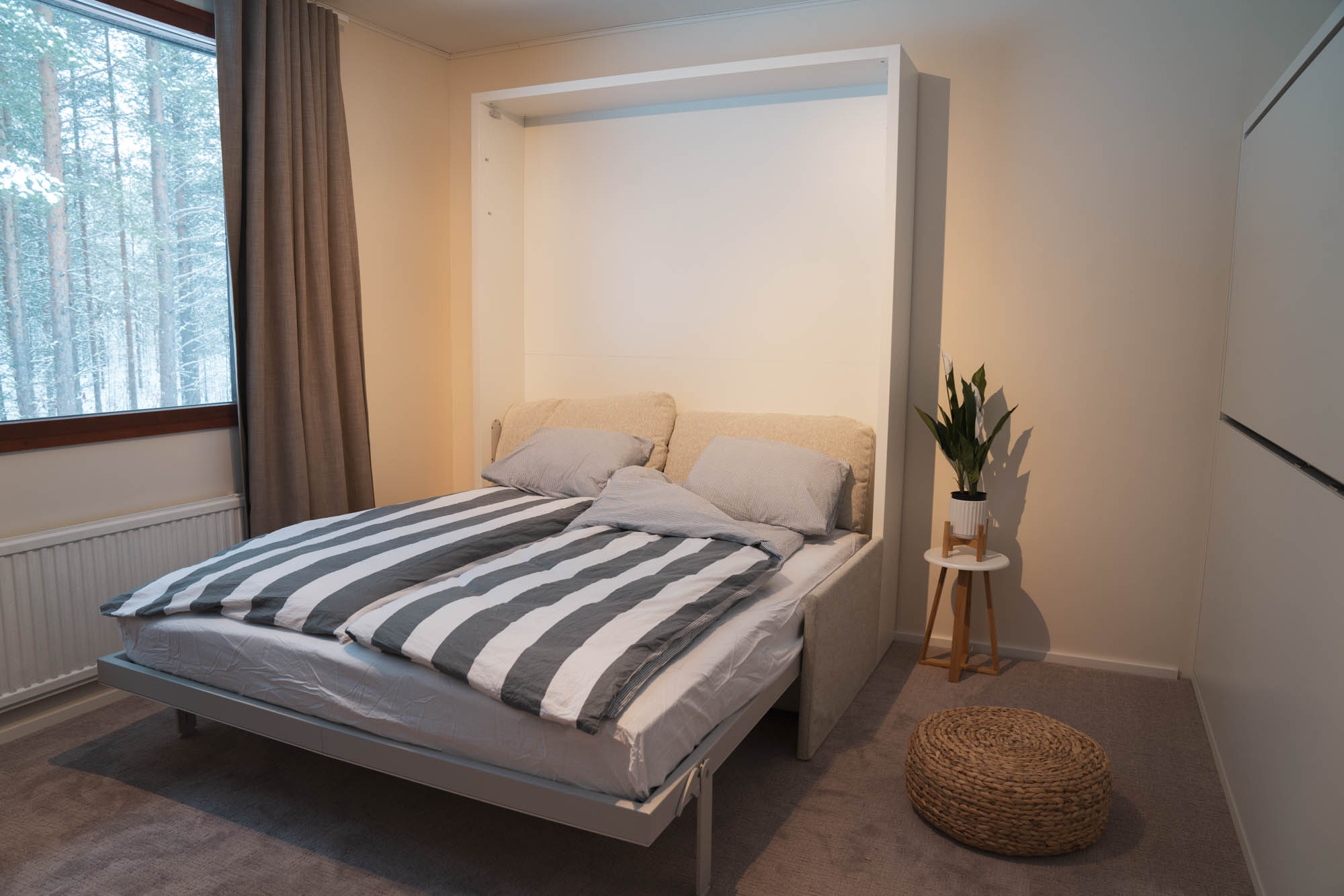 Hyvinvarustellussa keittiössä onnistuu lomakokkaukset vaivattomasti. Tilat ovat suunniteltu todella käytännöllisesti. Parisängyn saa päivän ajaksi nostettua ylös seinälle, jolloin sohva käytössä oleskeluun. Myös kerrosvuoteet lisävuoteina saa nostettua seinää vasten, niiden ollessa poissa käytöstä. Etätyöpiste nousee näppärästi sohvapöydästä.
